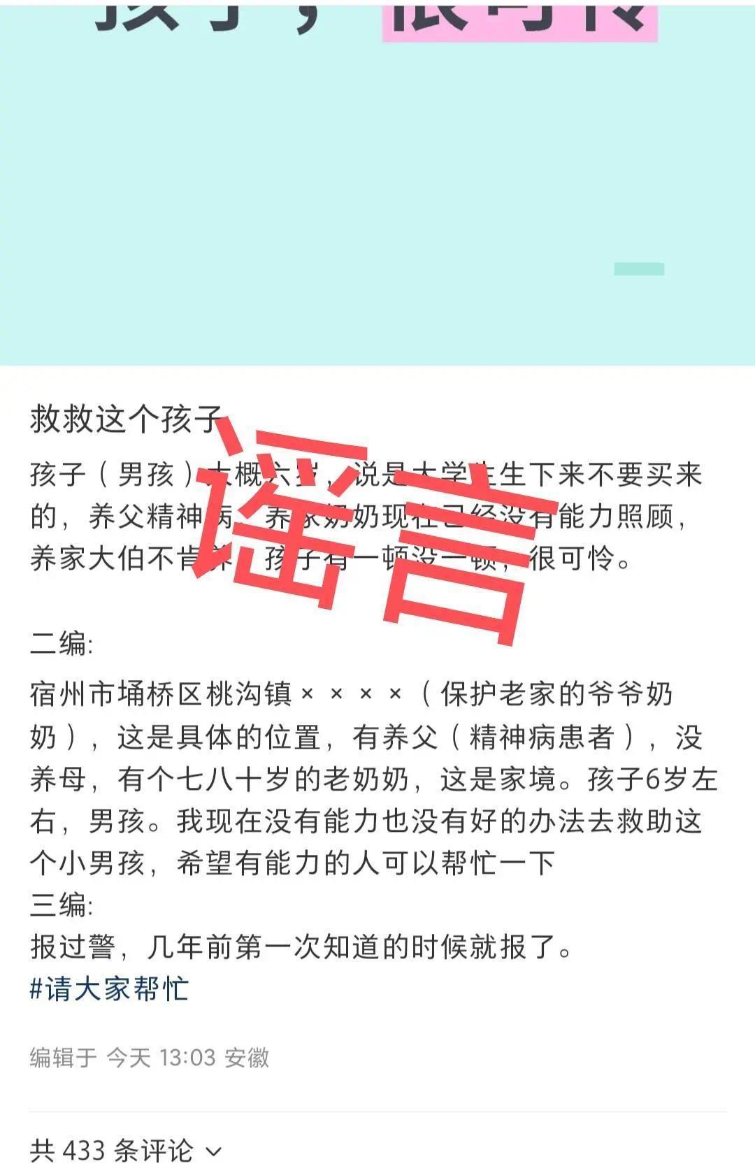 这位网友在帖子中称,男孩大概六岁,说是大学生生下来不要才买来的。养父患精神病,养家奶奶现在已经没有能力照顾,养家大伯不肯养,孩子有一顿没一顿,很可怜,她现在没有能力,也没有好的办法去救助这个小男孩,希望有能力的人可以帮忙一下。网帖还称,这户人家在宿州市埇桥区桃沟镇,养家的老奶奶已七八十岁。 这位网友所说的事情属实吗?1日下午,极目新闻记者将情况向桃沟镇政府进行通报后,工作人员告诉记者,经过初步核实,该网帖所说不属实,是谣言,公安机关也已经介入。 (注:图片及素材来源于网络,版权归原作者所有。如有侵权请联系删除,电话:027-85721622 。) 极目新闻 |