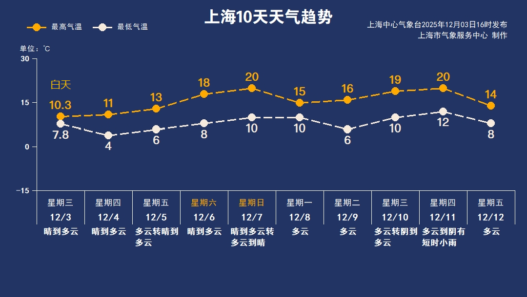 昨天夜间到今天下午申城风力增大 陆上部分地区出现6-7级阵风 其中以崇明东滩16.6米/秒为最大 气温下降 白天市区徐家汇站最高气温10.3℃ 奉贤站最高气温11.1℃ 为全市最高 傍晚以后气温进一步下降 风寒效应下 寒意会更明显 4日天气 受辐射降温影响,明天早上为本轮冷空气过程的气温最低点。市区最低气温仅在4℃左右,郊区零下2℃到1℃,有薄冰。白天是晴到多云的天气,最高气温11℃。风力减小,偏北风3-4级,相对湿度75%-25%。 明日天气提示:白天升温不明显,注意保暖。空气干燥,及时补水,注意用火用电安全。 未来天气趋势 周五白天起冷空气影响基本结束 气温略有上升 双休日最高气温 可达18-20℃,体感温暖 下周初还将有一次冷空气过程 周中期云系增多 可能伴有弱降水 未来一段时间气温起伏 大家注意调整着装,谨防感冒 干燥少雨的格局没有大的改变 防火安全不松懈 此外 上海的银杏迎来高光时刻啦 周末可以安排上 来源: 东方网综合