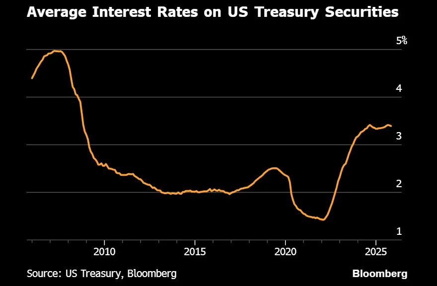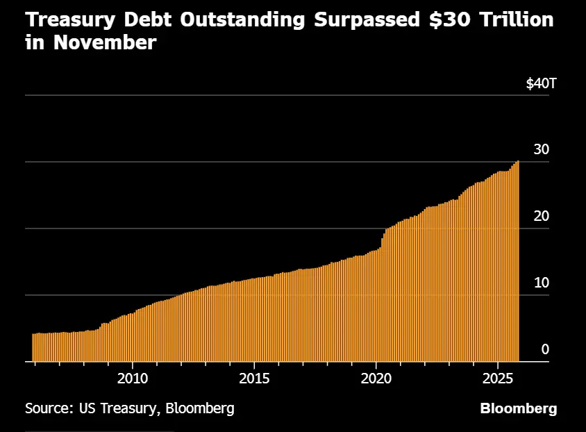 美国未偿国债规模在11月突破30万亿美元,短短七年内实现翻番。2020年为应对疫情而激增的借款是主要推动力之一。 更高的借款利率显著推高了偿债成本。过去十二个月的利息支出已达到1.2万亿美元,对联邦赤字构成持续压力。 法国巴黎银行美国利率策略主管古尼特·丁格拉指出,政府收支缺口长期存在,而疫情后大量高利率债务进一步加剧了利息成本对财政的冲击。