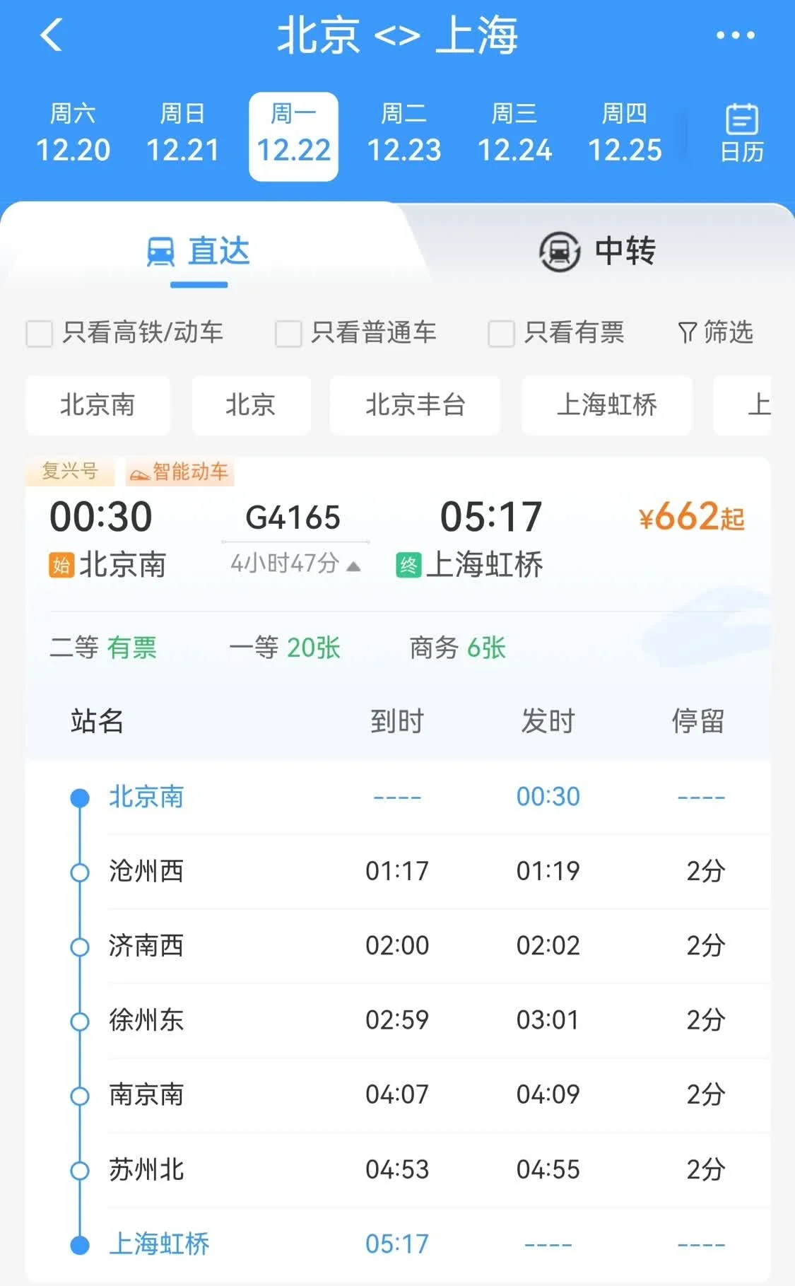 G4165次列车购票详情。图/12306APP截图 九派新闻发现,该列车为G4165复兴号智能动车,于凌晨0时30分从北京南出发,早上5时17分到达上海虹桥站,中途停靠沧州、济南、徐州、南京、苏州。12306APP显示,该列车仅在12月22日运行,其余日期暂无该班列车。 12月16日,12306客服称,因为当天客流比较多,该列车系应客流需求临时增加的一班列车。目前只有12月22日有这一趟,属于临时通知,后续暂不清楚是否还会安排。 九派新闻记者 辜子旋 编辑 王佳箐 任卓 九派新闻