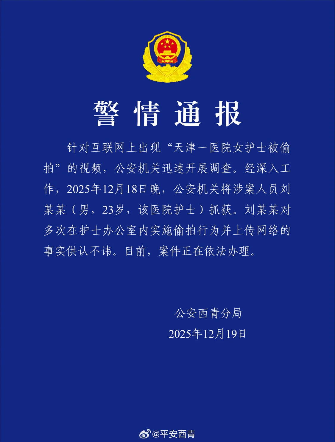 天津一医院女护士被偷拍,警方通报