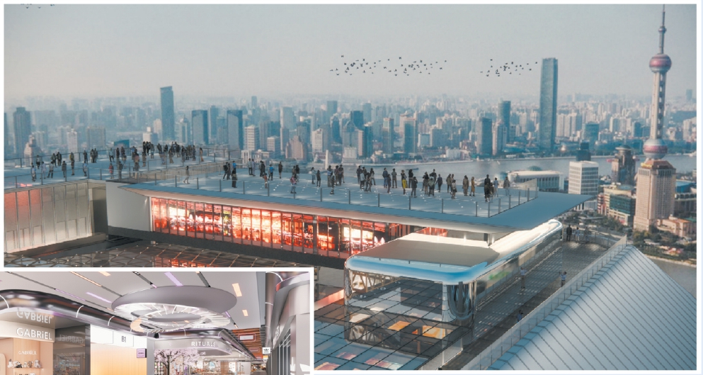 高区改造示意图。改造完成后将成为城市级观景平台,近可俯瞰外滩第一立面,远可眺望陆家嘴城市天际线。