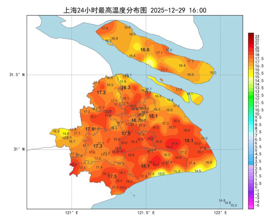东方网记者柏可林12月29日报道:刚入冬的上海,仿佛又回暖到了初春。由于今天白天冷空气影响偏北,南方水汽条件较弱,上海天气晴好,阳光助力下气温回升,全市最高气温多在17、18℃上下,其中徐家汇站16.7℃,午后体感暖和舒适。