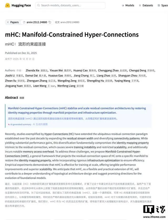 IT之家附摘要部分大意如下: 最近,以超连接(HC)为例的研究通过扩展残差流宽度和多样化连接模式,扩展了过去十年建立的无处不在的残差连接范式。虽然产生了显著的性能提升,但这种多样化从根本上损害了残差连接固有的恒等映射属性,从而导致严重的训练不稳定性和受限的可扩展性,并且还会产生显著的内存访问开销。 为了应对这些挑战,我们提出了流形约束超连接(mHC),这是一个通用框架,可将 HC 的残差连接空间投影到特定的流形上,以恢复恒等映射属性,同时结合严格的基础设施优化以确保效率。 经验实验表明,mHC 对于大规模训练是有效的,可提供切实的性能改进和卓越的可扩展性。我们预计,mHC 作为 HC 的灵活且实用的扩展,将有助于更深入地理解拓扑架构设计,并为基础模型的演进提出有希望的方向。 论文链接 Hugging Face:https://huggingface.co/papers/2512.24880 Arxiv:https://arxiv.org/abs/2512.24880 IT之家