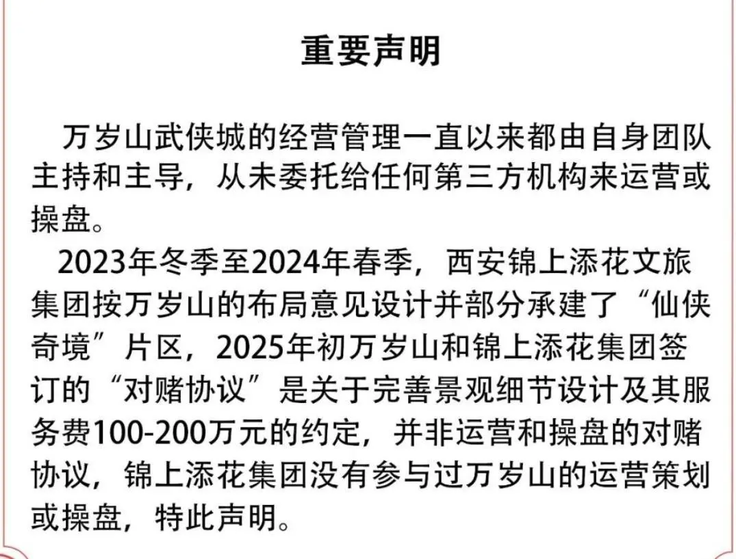 万岁山武侠城发布重要声明 此前有多家媒体报道称,万岁山与其运营商锦上添花文旅集团在2025年初签署了一份对赌协议。协议约定,运营商需助推景区2025年全年销售额突破11亿元,方可获得全部服务费,否则将分文不取。 年报当中,万岁山武侠城对此发布重要声明:万岁山武侠城的经营管理一直以来都由自身团队主持和指导,从未委托给任何第三方机构来运营或操盘。 2023年冬季至2024年春季,西安锦上添花文旅集团按万岁山的布局意见设计并部分承建了“仙侠奇境”片区,2025年初万岁山和锦上添花集团签订的“对赌协议”是关于完善景观细节设计及其服务费100-200万元的约定,并非运营和操盘的对赌协议,锦上添花集团没有参与过万岁山的运营策划或操盘,特此声明。 万岁山武侠城表示,会坚守创新和超值原则,会立足游客需求,更加注重品质服务和每一位游客的体验,追求一流,致力于不断提升,不断创新。“快乐源泉”是我们的经营宗旨,为游客源源不断地奉献快乐时光是我们的基本使命,我们会持续为之努力,使万岁山成为广大游客的快乐家园,使游客乐于常回家看看。2026是中国传统的马年,真诚祝福广大游客如天马行空,多一些心情放飞,多一些洒脱! 资料显示,万岁山武侠城位于河南省开封市。2025年12月24日抖音生活服务发布的《2025文旅数据报告》当中,开封跻身全国十大热门宝藏城市;开封万岁山武侠城荣登全国十大热门景点榜首。 责任编辑:胥甜 审核:谢礼逵 极目新闻