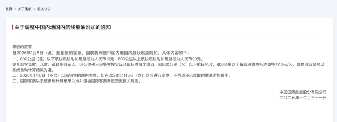 东航、南航、国航,集体调整 12月31日,东方航空、南方航空和中国国际航空发布通知,自2026年1月5日(含)起销售的客票,调整国内航线旅客运输燃油附加费征收标准。 东航具体标准如下: 一、国内航线旅客运输燃油附加费收取标准:800公里(含)以下航段,每位旅客收取人民币10元;800公里以上航段,每位旅客收取人民币20元。 二、按规定享受国内民航成人普通票价10%的婴儿,免收燃油附加费。 三、按规定购买国内民航成人普通票价50%的儿童(含无成人陪伴儿童)、革命伤残军人和因公致残的人民警察,旅客运输燃油附加费收取标准为:800公里(含)以下航段,免收燃油附加费;800公里以上航段,每位旅客收取人民币10元。 四、国际客票以系统实际计算结果为准。 五、燃油附加费的起征日期以原出票日期为准,2026年1月5日以前销售的国内客票,如变更至2026年1月5日(含)以后,已收取的燃油附加费不退不补。