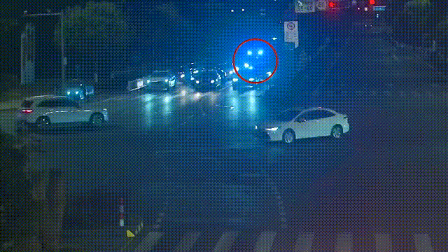 仅隔不到三分钟 救护车行至滨海大道盐北路口时 再次被红灯拦住去路 右侧车道的 浙FDS9504、浙F85A92 迅速驶出 苏U22651紧随其后 向左前方45度让行 最大程度拓宽了礼让空间 救护车又一次得以快速通过