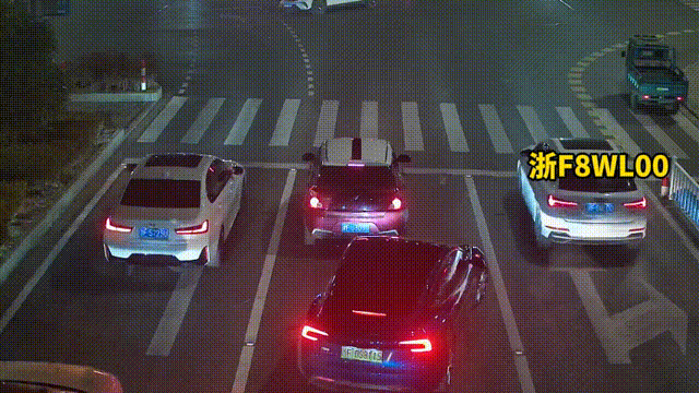 这时 位于右侧车道最前方的 浙F8WL00 率先察觉、秒级反应 向前驶出45度方向让出车道 后方及相邻车道上的 浙F08U1V、浙F572SU、浙FJ3D31 浙FDM0095、浙FDS8115、浙F2051C 也默契避让 迅速在车流中 开辟出一条生命通道