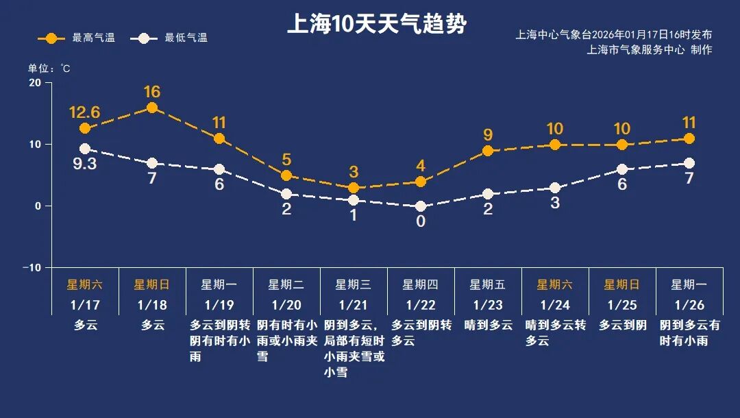 据上海中心气象台监测,昨夜今晨,上海大部地区出现能见度小于500米的雾,崇明、浦东、奉贤、宝山能见度不足200米,崇明和浦东等沿江沿海地区能见度小于50米。不过,今天白天的天气不如昨天那样晴好,云系变多、风力增大,体感温度也要比昨天低一些。 好消息是,明天白天阳光将重现申城,最高温为16℃,适宜外出活动。不过大家要好好珍惜这个周末了,这或许将是近期最后的温暖天气。 中央气象台预报,2026年大范围寒潮天气来袭,受其影响,17日至21日,我国大部地区将自西北向东南出现降温大风,日平均或最低气温普遍下降6℃至12℃。1月21日早晨,最低温度0℃线将南压至贵州到浙江南部一带。 下周进入农历腊月,大寒节气接踵而至,上海天气将发生冷暖大逆转。受强冷空气影响,上海下周一至下周三有大风降温和雨雪天气过程。周一气温走低,上午还有11℃,晚归时气温跌破7℃,可能伴有短时小雨。周二和周三还将出现小雨夹雪或小雪天气,市区最低气温1℃至2℃,郊区将跌破冰点,最高气温也仅有3℃至5℃。偏北风一吹,风寒效应加剧,体感湿冷。 下周三夜里起,上海雨雪渐止转阴到多云,下半周将以晴冷天气为主,体感由湿冷转为干冷。未来十天,上海气温起伏较大,大家要及时增添衣物,谨防感冒。 来源: 上观新闻 |