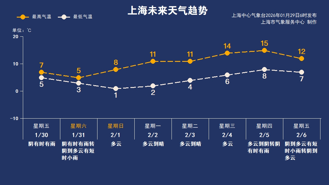 上海今天白天多云,早间市区最低气温4℃左右,郊区-2℃~0℃,有薄冰,最高气温升至11℃。上午起风力增大,偏东风4-5级,沿江沿海地区阵风有6级。 #上海周五周六将有明显降水# 周五早上开始飘雨,大家出行注意道路交通安全。雨水打压,周五气温仅在5℃-7℃之间,下班时段雨势不减体感阴冷,大家做好防风、防雨、保暖措施。周六降水持续,气温下降至5℃以下,体感更冷。伴随气温下降,夜间上海西部和北部地区可能会出现短时小雨夹雪。周日早间气温来到近期低点,白天转为多云天气,气温逐日回升。 |