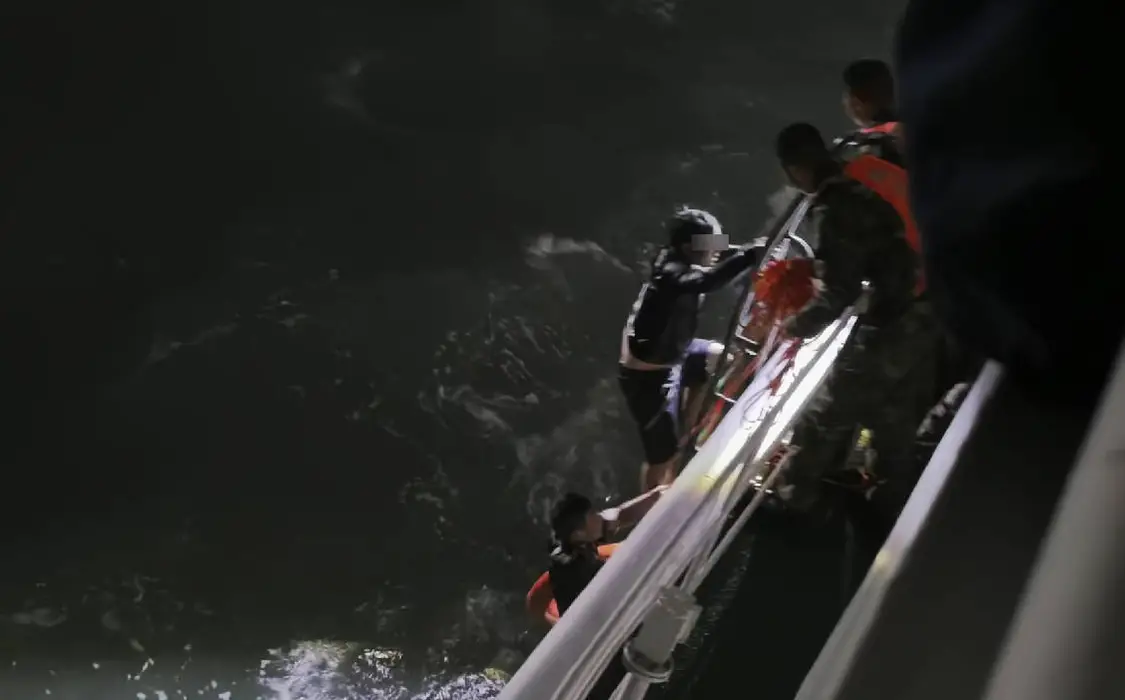 搜救画面 现场救援视频显示,海面上漆黑一片,搜救灯光照射到2名落水人员,其当时正扒着救生圈,在波涛中跌宕起伏,飘摇不定。发现海警救援人员后,落水人员向救援人员拼命挥手呼救。随后,海警救援人员立即对该2名船员大声喊话并进行劝慰安抚鼓励,同时,海警人员瞅准时机成功将提前套好救生索的救生圈撇至落水的二人附近,引导他们接住救生索,并将救生圈套在身上,海警救援人员随即将两人拉至舰艇舷边,使用事先准备好的救生软梯成功将落水的2人转移至执法艇甲板。落水人员安全登上舰艇后,救援人员又对该2名落水人员进行伤口处理。