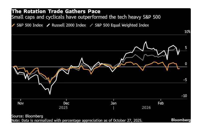 哈特内特表示,尽管受访者对全球企业盈利前景持自2021年8月以来最乐观的看法,但他们仍然认为目前的资本支出“过热”。 另一方面,哈特内特在报告中写道,投资者正在抛售科技股和美元,并增加对能源、原材料和必需消费品的配置。科技股配置的降幅为2025年3月以来最大,受访者对该行业的净超配比例仅为5%,远远低于一个月前的19%。 与此同时,资金从美国股市轮动到新兴市场和欧洲市场的规模达到了自2021年2月以来的最高水平。 此外,近期小盘股的优异表现也凸显了市场正从科技巨头转向其他股票。自2021年4月以来,受访者对小盘股的配置比例远高于大盘股。