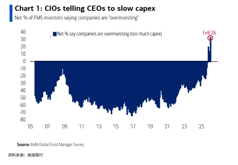 财联社2月17日讯(编辑 黄君芝)随着人工智能(AI)泡沫“越吹越大”,相关支出“水涨船高”,投资者的担忧情绪正愈演愈烈。美国银行(Bank of America Corp.)2月份的全球基金经理调查显示,创纪录数量的投资者认为企业支出过高。 这项调查于2月6日至12日进行,162名投资者参与调查,他们手中管理着4400亿美元的资产。 美银分析师迈克尔·哈特内特(Michael Hartnett)在报告中写道,尽管参与该项调查的投资者看涨情绪达到了2021年6月以来的最高水平,但约有35%的人警告称企业正出现过度投资的情况,这是过去二十年来数据中所见的最高比例。他们同时也在减少对科技股的敞口。 今年资本支出预计将创历史新高,美国四大科技公司合计2026年支出预计将达到约6500亿美元。市场对这些预测反应不一:微软股价遭遇近六年最大跌幅,因投资者担忧投资回报周期过长,而Meta Platforms Inc.公布雄心勃勃的人工智能支出计划后股价飙升逾11%。 在美银最新调查中,四分之一的受访者认为“人工智能泡沫”是市场面临的最大尾部风险,而30%的受访者则表示,大型科技公司在人工智能方面的资本支出最有可能引发信贷危机。