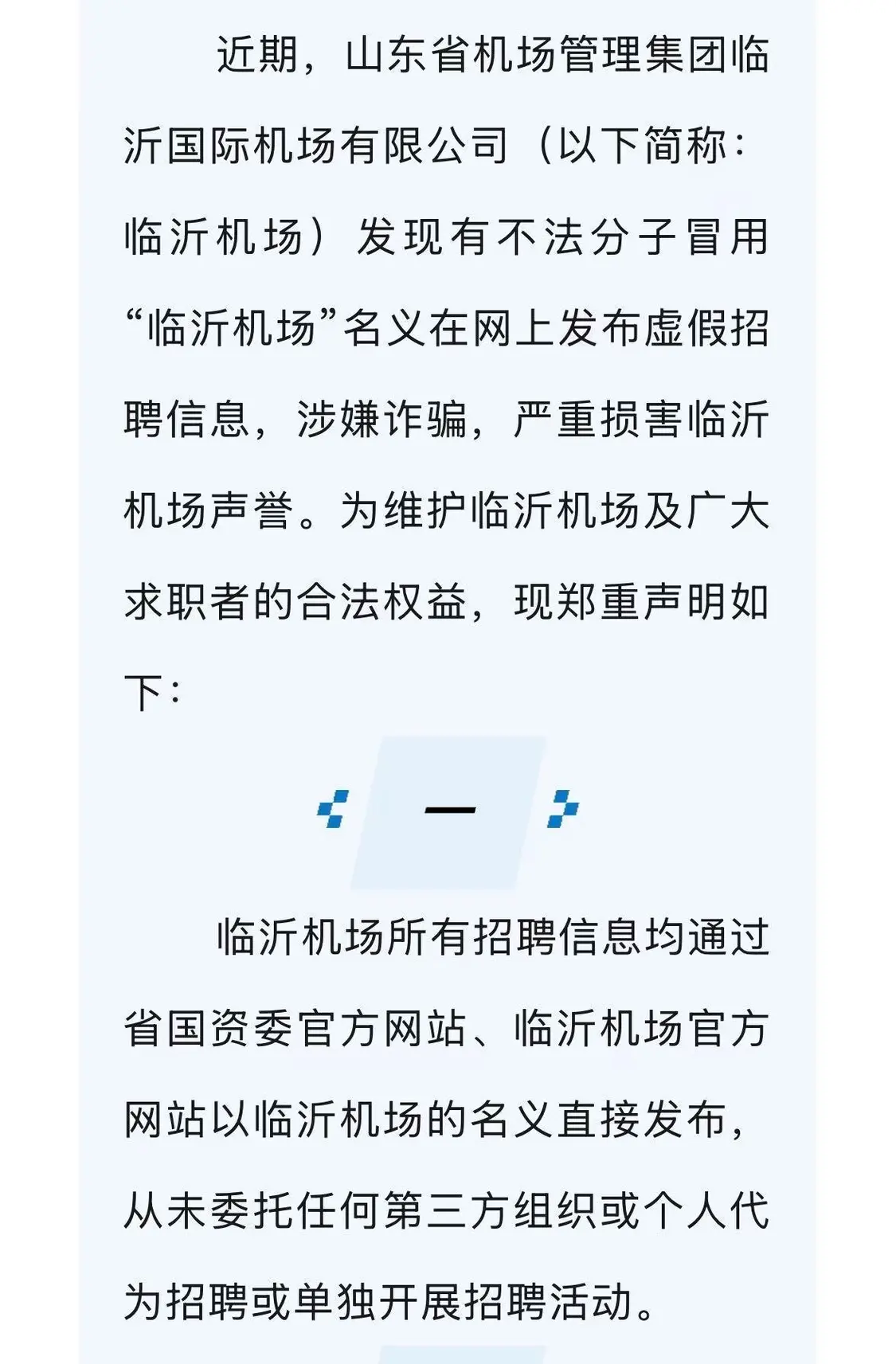 记者查询发现,2025年9月8日,山东省机场管理集团临沂机场曾发布郑重声明,称有不法分子冒用“临沂机场”名义发布虚假招聘信息,涉嫌诈骗,严重损害机场声誉。声明强调,临沂机场所有招聘信息均通过省国资委官方网站、临沂机场官方网站以临沂机场的名义直接发布,从未委托任何第三方组织或个人代为招聘或单独开展招聘活动。