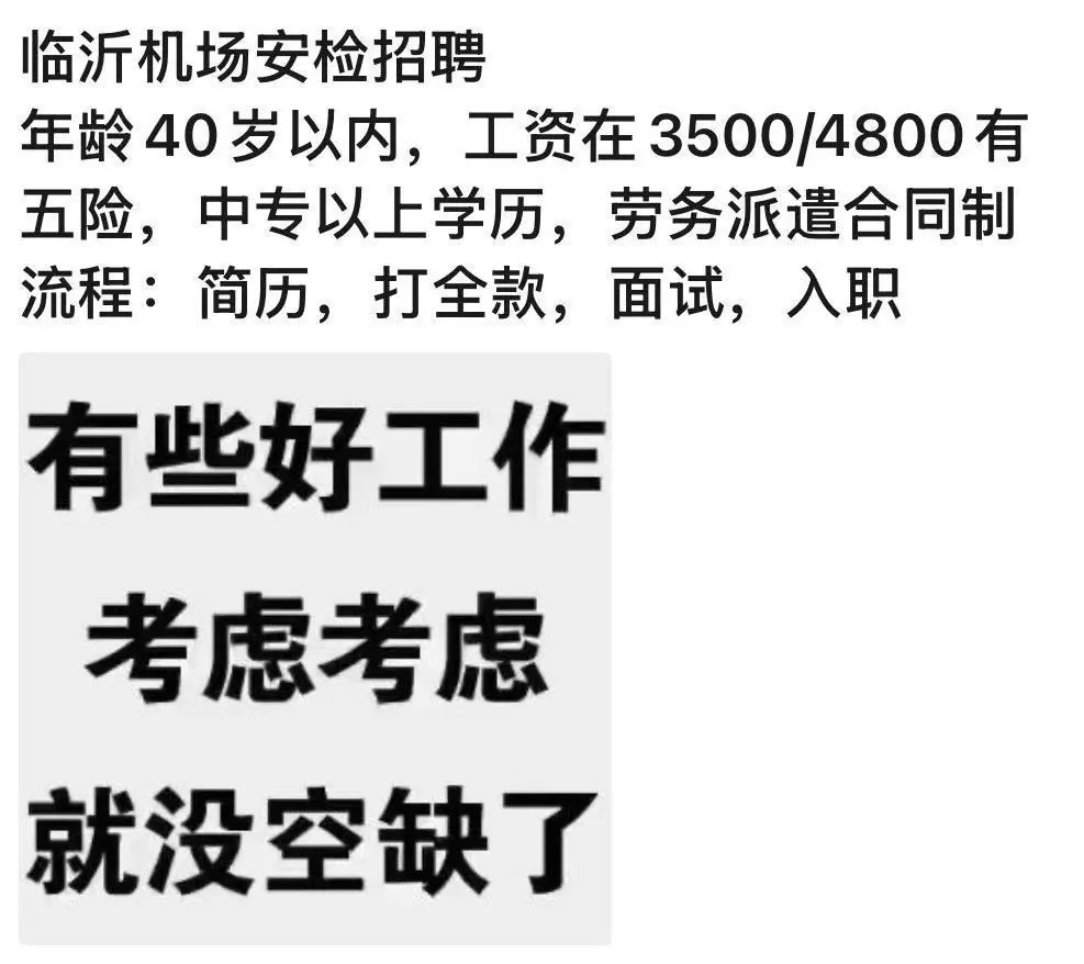 随后,记者询问了发帖网友咨询的“临沂机场安检岗”,该中介要求提供一份简历。当记者回复“没简历,00年出生、本科生”后,中介开价6000元,称需见面签合同,表示“岗位包进,不入职会退钱”。中介发布的该岗位信息显示:临沂机场安检招聘,年龄40岁以内,工资3500至4800元,有五险,中专以上学历,劳务派遣合同制,流程为“简历-打全款-面试-入职”,可三天之内上班。