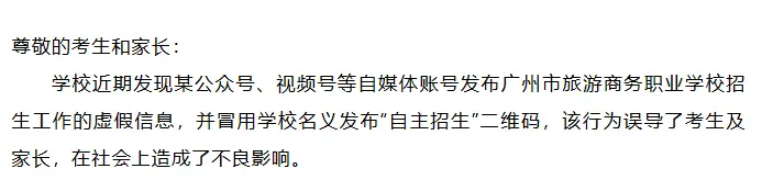 广州市旅游商务职业学校则特别提醒,有不法分子冒用学校名义发布“自主招生”二维码,企图骗取考生和家长信任。
