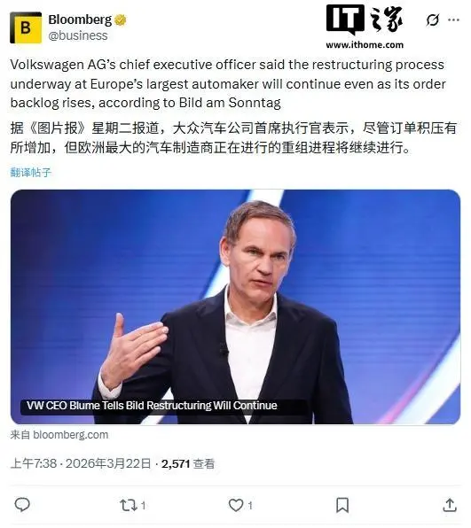 在此次采访中,布鲁姆再次重申了公司正在进行的改革计划,即到 2030 年在德国裁减 5 万个工作岗位,这是其持续重组计划的一部分。 他强调,即便订单积压量上升,大众仍在坚定推进重组计划。布鲁姆在接受采访时称,为避免成本高昂的产能过剩,大众正对所有工厂 —— 无论是在德国、欧洲还是中国 —— 实施“明确的制造成本目标”。“未来我们将持续审视产能。重组将继续进行。” 布鲁姆称,大众在本土市场的成本结构较高,其中包括劳动力成本,“我们必须通过提高生产率来抵消这一劣势。我们的能源成本太高,监管也过多。在德国开发和制造汽车,然后再出口的模式已经行不通了,因为全球各个地区的情况都发生了变化。” 大众汽车此前预测,受关税、电动汽车支出以及来自中国日益激烈的竞争等因素拖累,今年其运营回报率可能低至 4%。 IT之家