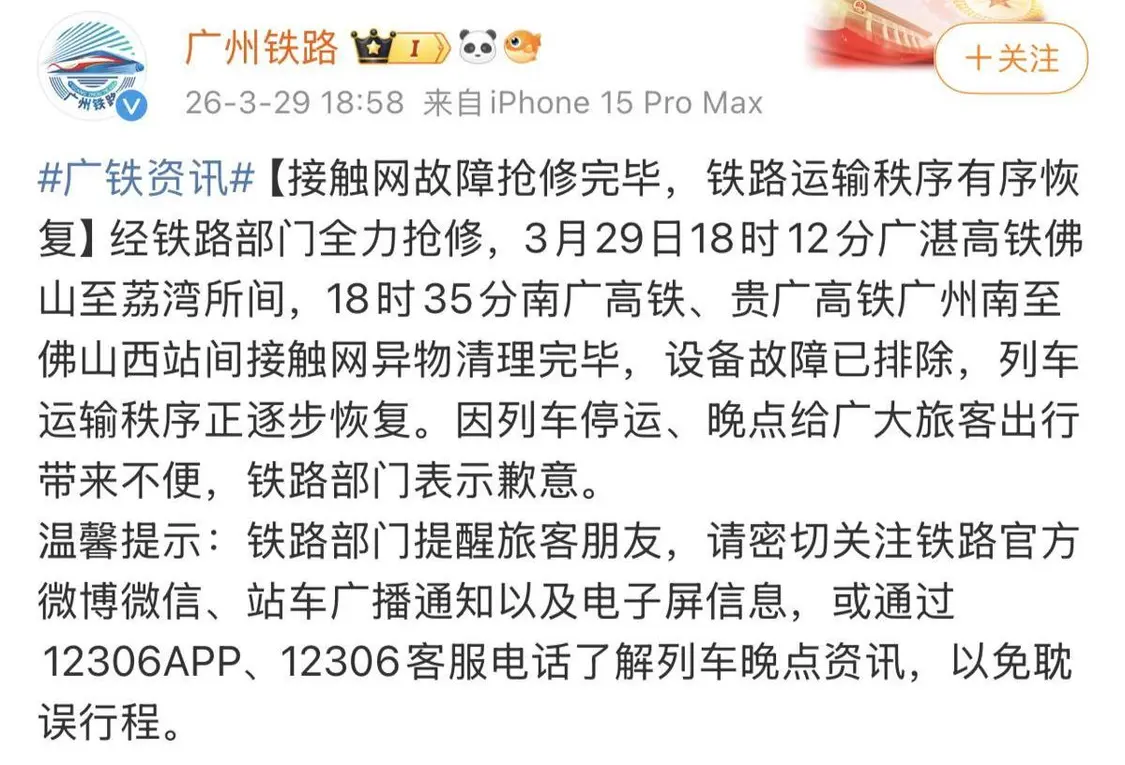 广东出现高铁接触网挂异物故障,部分列车晚点