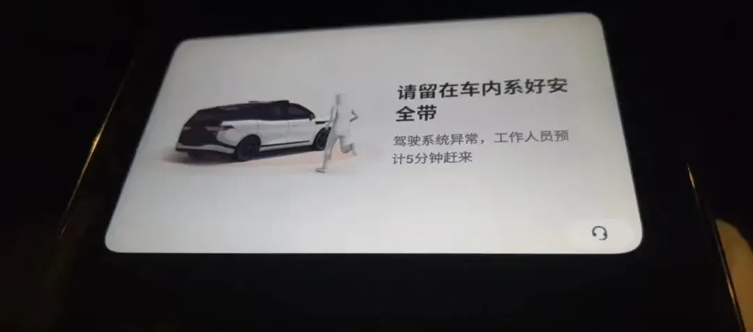 ▲乘客提供的萝卜快跑停车后的信息提示 一位遭遇萝卜快跑故障的武汉居民告诉红星新闻记者,其在21点左右上车,“刚起步就有点卡,但行驶路线是对的,拐了个弯就直接不动了,屏幕就显示‘请留在车内系好安全带,驾驶系统异常,工作人员预计5分钟赶来’,等了10分钟,还是没反应。” 该乘客表示,车辆停止后,自己点了萝卜快跑屏幕上的客服图标,给客服打电话,但未接通。“我就按车顶上的SOS按钮,有电话铃声,大概十几秒有客服接通了,问了我的行程之后,说是网络故障,工作人员在赶来,可以给我退钱然后让我先下车。开门按钮是正常的,按了能开,我就下车走了。”