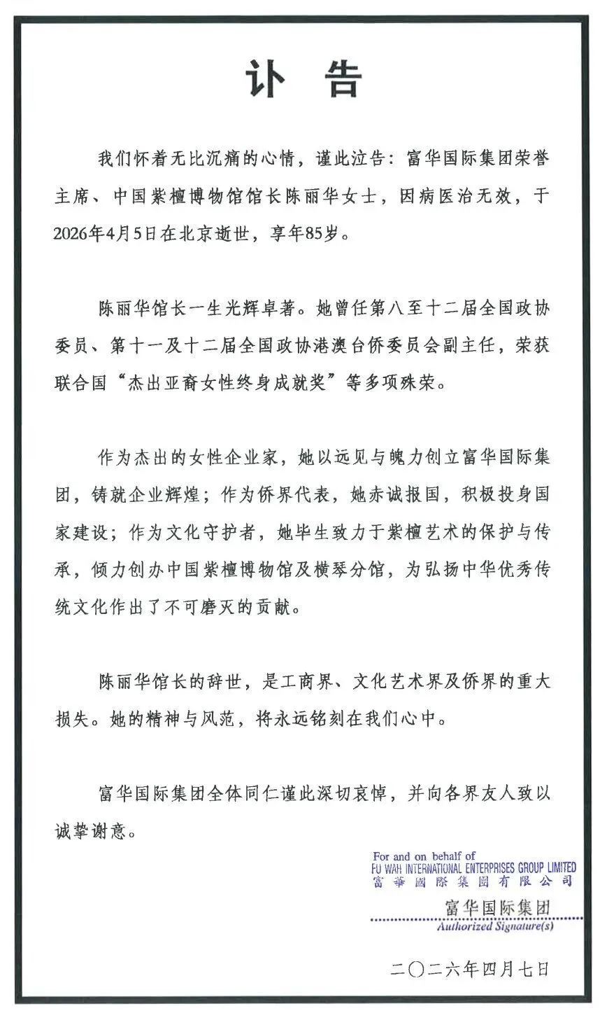 我们怀着无比沉痛的心情,谨此泣告:富华国际集团荣誉主席、中国紫檀博物馆馆长陈丽华女士,因病医治无效,于2026年4月5日在北京逝世,享年85岁。