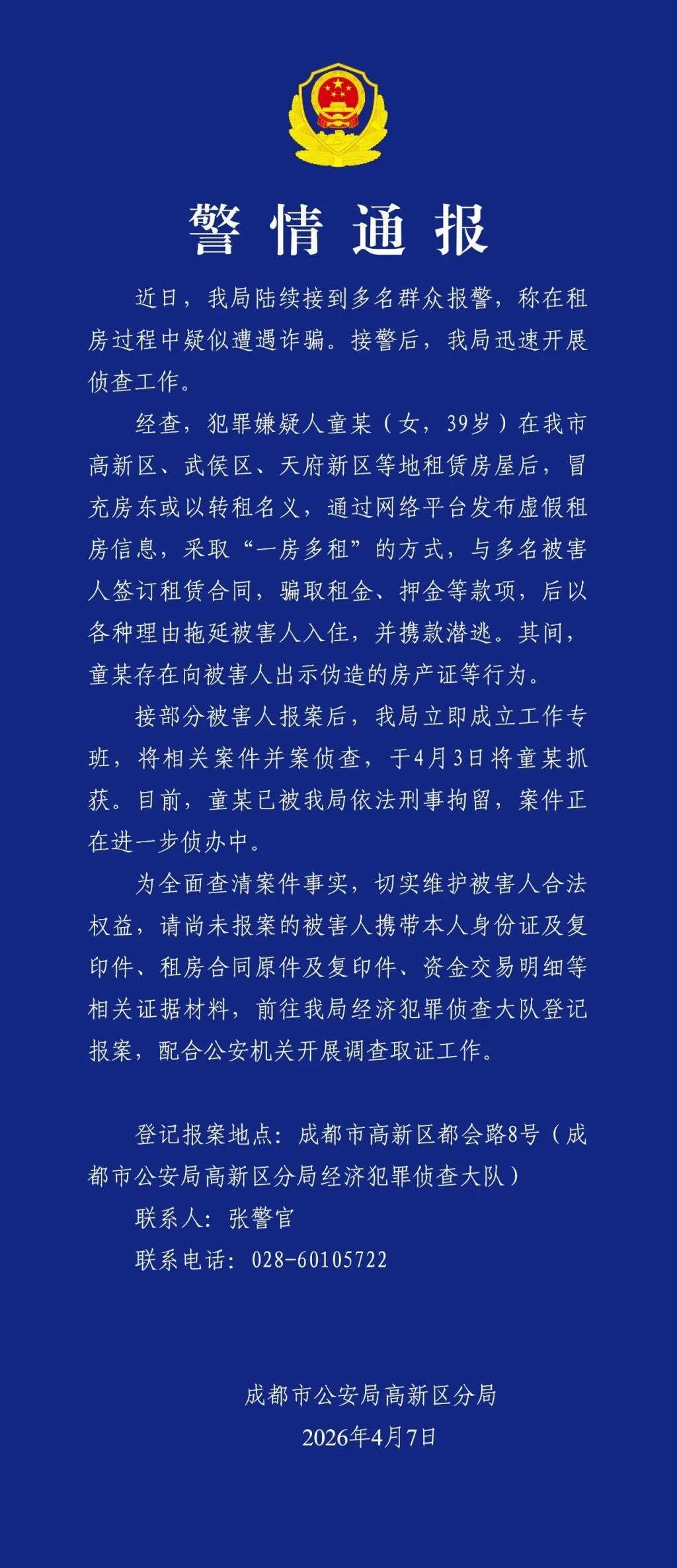 39岁女子冒充房东骗房租,成都警方通报