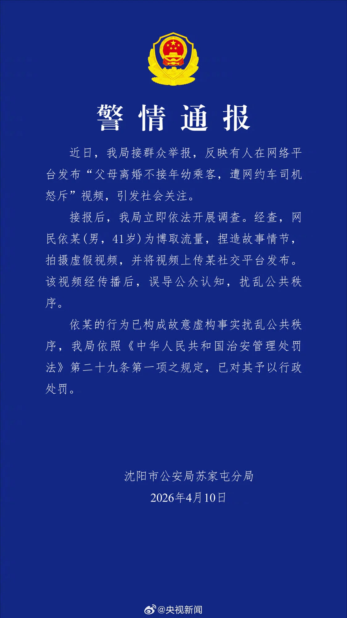 近日,沈阳市公安局苏家屯分局接群众举报,反映有人在网络平台发布“父母离婚不接年幼乘客,遭网约车司机怒斥”视频,引发社会关注。