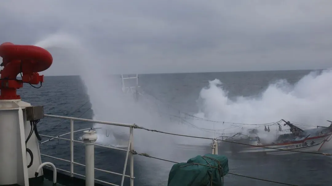 △海警舰艇对失火渔船进行灭火