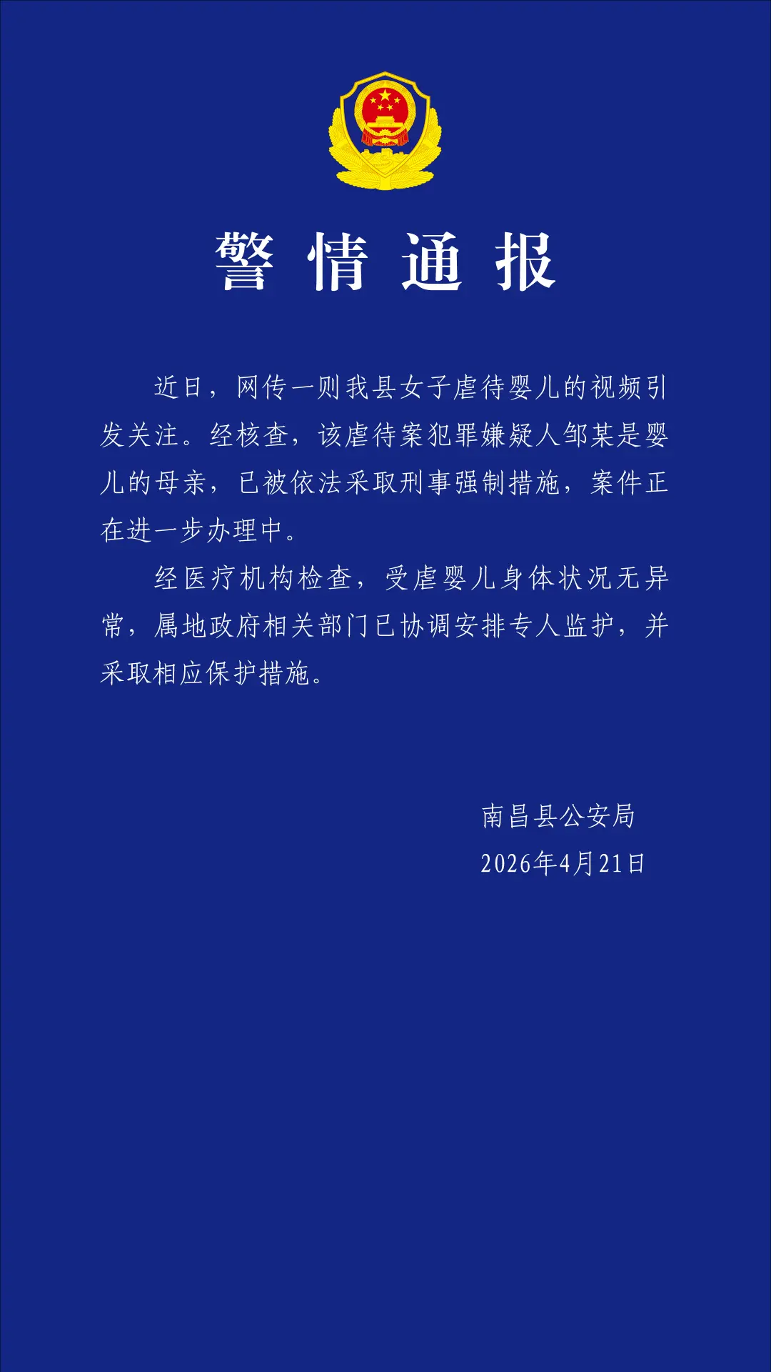 警情通报 近日,网传一则我县女子虐待婴儿的视频引发关注。经核查,该虐待案犯罪嫌疑人邹某是婴儿的母亲,已被依法采取刑事强制措施,案件正在进一步办理中。 经医疗机构检查,受虐婴儿身体状况无异常,属地政府相关部门已协调安排专人监护,并采取相应保护措施。 南昌县公安局 2026年4月21日
