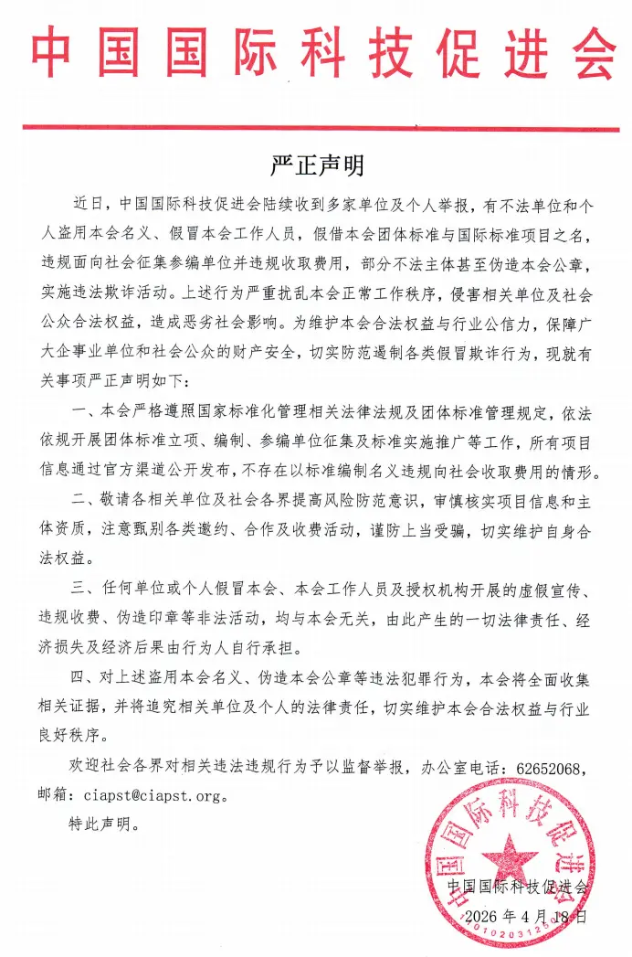 声明表示,“近日,中国国际科技促进会陆续收到多家单位及个人举报,有不法单位和个人盗用本会名义、假冒本会工作人员,假借本会团体标准与国际标准项目之名,违规面向社会征集参编单位并违规收取费用,部分不法主体甚至伪造本会公章,实施违法欺诈活动。上述行为严重扰乱本会正常工作秩序,侵害相关单位及社会公众合法权益,造成恶劣社会影响。”