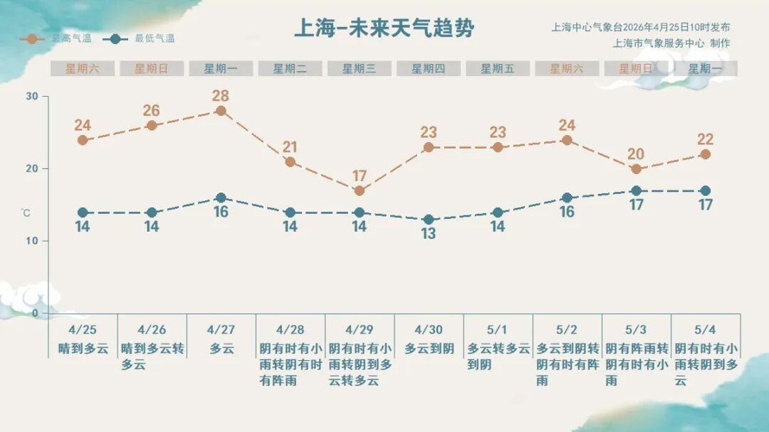 双休日天气:这个双休日延续晴好天气,阳光明媚气温攀升,适宜大家安排洗晒或出游。受辐射降温影响,昨夜今晨本市大部郊区出现大雾天气,崇明、宝山和奉贤的个别站点能见度低于100米。早间全市气温起步在8~14℃之间,白天阳光大放送,预计今天最高气温24℃,偏东风3~4级,沿江沿海地区4~5级,相对湿度90%~45%。明天最高气温可进一步升至26℃。 天气趋势:预计下周一最高气温可达28℃,将是近期气温的一个高点。不过春季晴雨交替较快,下周二至周三又会有一次较明显的降雨大风天气,气温也随着回落,周三最高气温仅有17℃。气温“颠簸”,起伏很大,提醒大家及时关注最新预报信息。 昨日天气回顾 昨天阳光给力,气温回升明显,午后市区徐家汇站最高气温升至23.5℃,温暖舒适春意盎然。不过早晚凉意还在,市区徐家汇站最低13.2℃,部分郊区最低气温仍在个位数。 来源: 上海发布